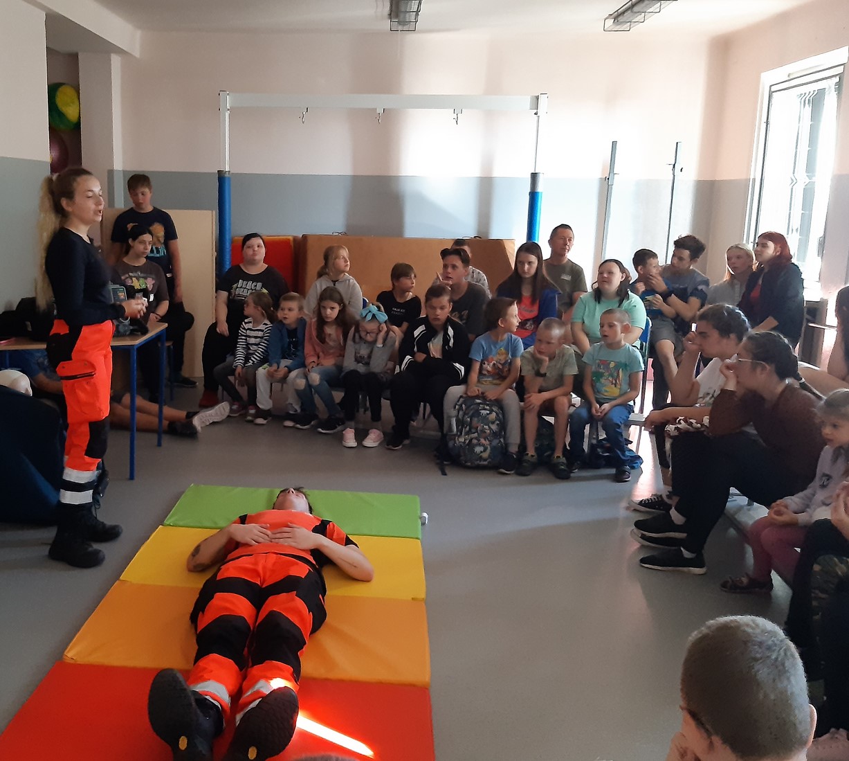 28.09.2023 r. uczniowie uczestniczyli w zajęciach z Pierwszej Pomocy zorganizowanych przez Szkołę Ratownictwa Wojewódzkiej Stacji Ratownictwa Medycznego w Łodzi. W czasie warsztatów prowadzący przekazali uczniom informacje na temat zasad udzielania pomocy w sytuacjach zagrożenia życia i zdrowia, omówili zagadnienia związane ze sprawdzaniem przytomności, wezwaniem karetki pogotowia, układaniem poszkodowanego w pozycji bocznej ustalonej, wykonywaniem ucisków klatki piersiowej. Uczniowie mogli obejrzeć karetkę i jej wyposażenie. Bardzo chętnie i aktywnie wzięli udział w części praktycznej, wykonując podstawowe czynności ratownicze. Było to niezwykle ważne spotkanie, gdyż uwrażliwiło Nas na potrzebę reagowania w sytuacjach zagrożenia zdrowia i dostarczyło wiedzy, która w przyszłości być może przyczyni się do uratowania komuś życia. Kierujemy wielkie podziękowania do ratowników medycznych za bardzo ciekawą lekcję.
